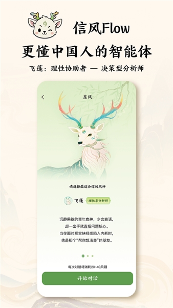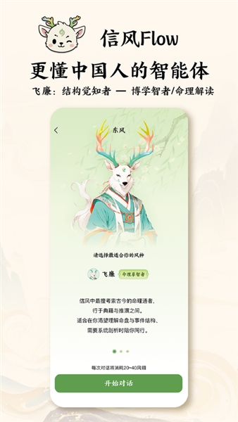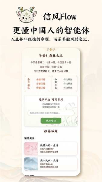 信风Flow专为国人打造的AI智能体助手,这里主打许多传统文化内容,提供三位不同的AI角色,包括情绪之风、选择之风、命理之风,大家可根据自己的需求选择AI智能体进行问答,输入问题就可以快速获得答案,随时随地为大家提供个性化的陪伴。可以根据你的八字来进行算命,它通过个性化陪伴和结构化提问,帮助用户缓解情绪波动、理清人生困惑,并做出更清晰的选择,软件带有一些AI智能体,我们可以任意选择自己感兴趣的智能体进行对话和聊天。